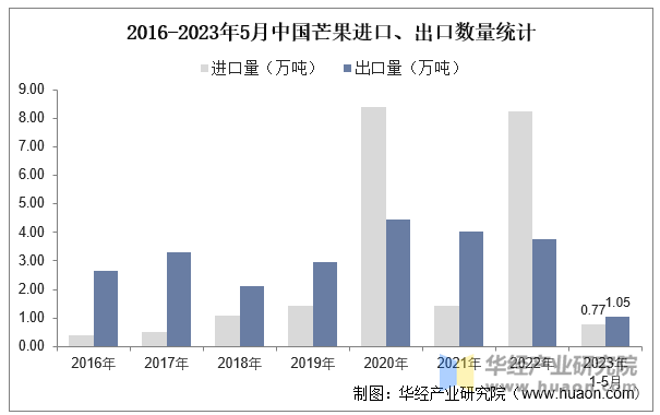 2016年至2021年期间中国芒果产量同比增加率逐年增加,2021年全国芒果产量增速逐步放缓。中国芒果产量正在各从产区的分布取芒果园面积分布较为分歧,产量排名前五的产区同样顺次为云南、广西、海南、四川以及广东,广东芒果产量同样取前四个产区的芒果产量呈现较大的差别。进口额为0。57亿美元;出口数量为3。77万吨,出口额为0。58亿美元。截至5月我国2023年芒果的出口数量为1。05万吨。